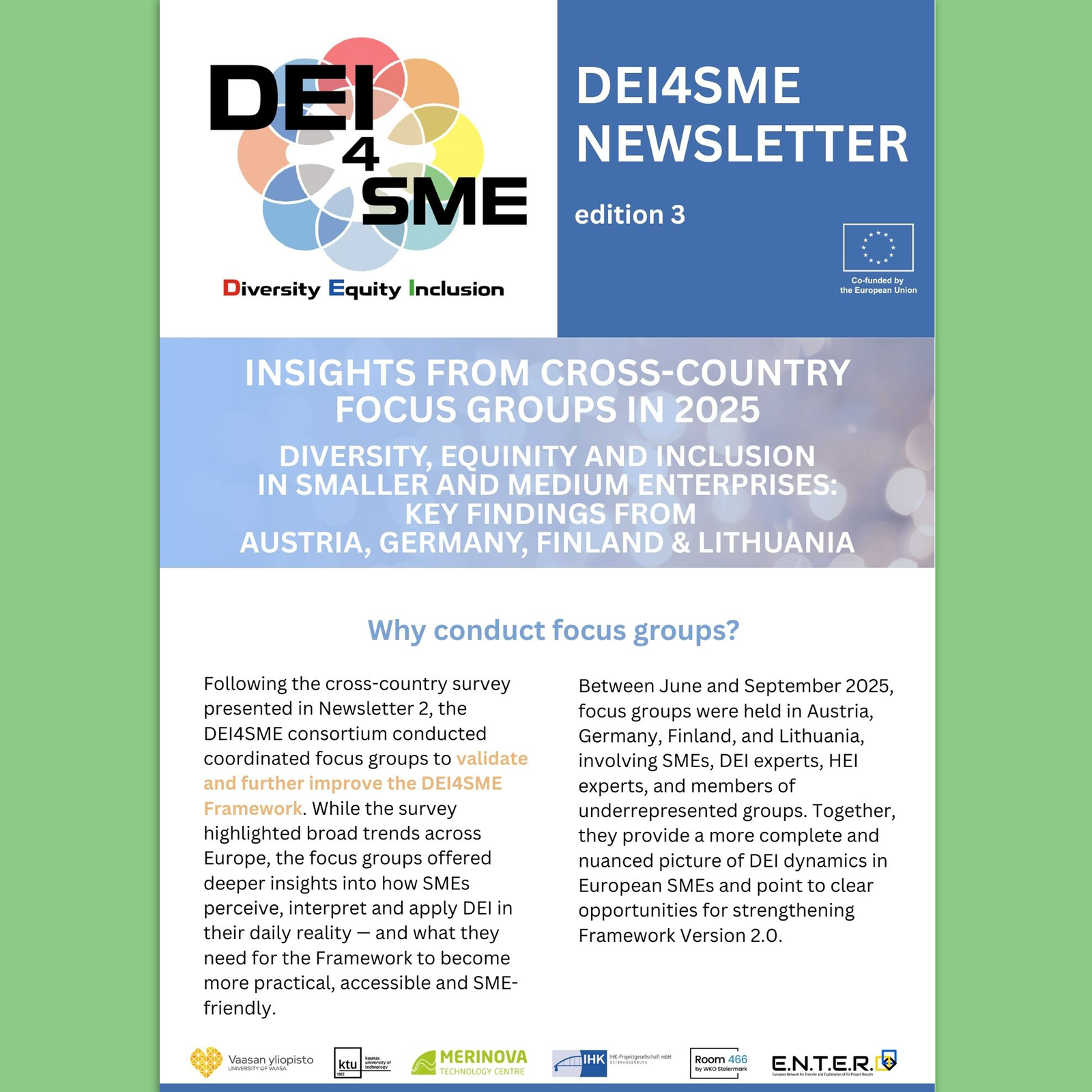 DEI4SME is an Erasmus+ project co-funded by the European Union, uniting six partner organisations from Finland, Germany, Austria, and Lithuania for the mission to enable DEI (Diversity, Equity, and Inclusion) in business and business education.